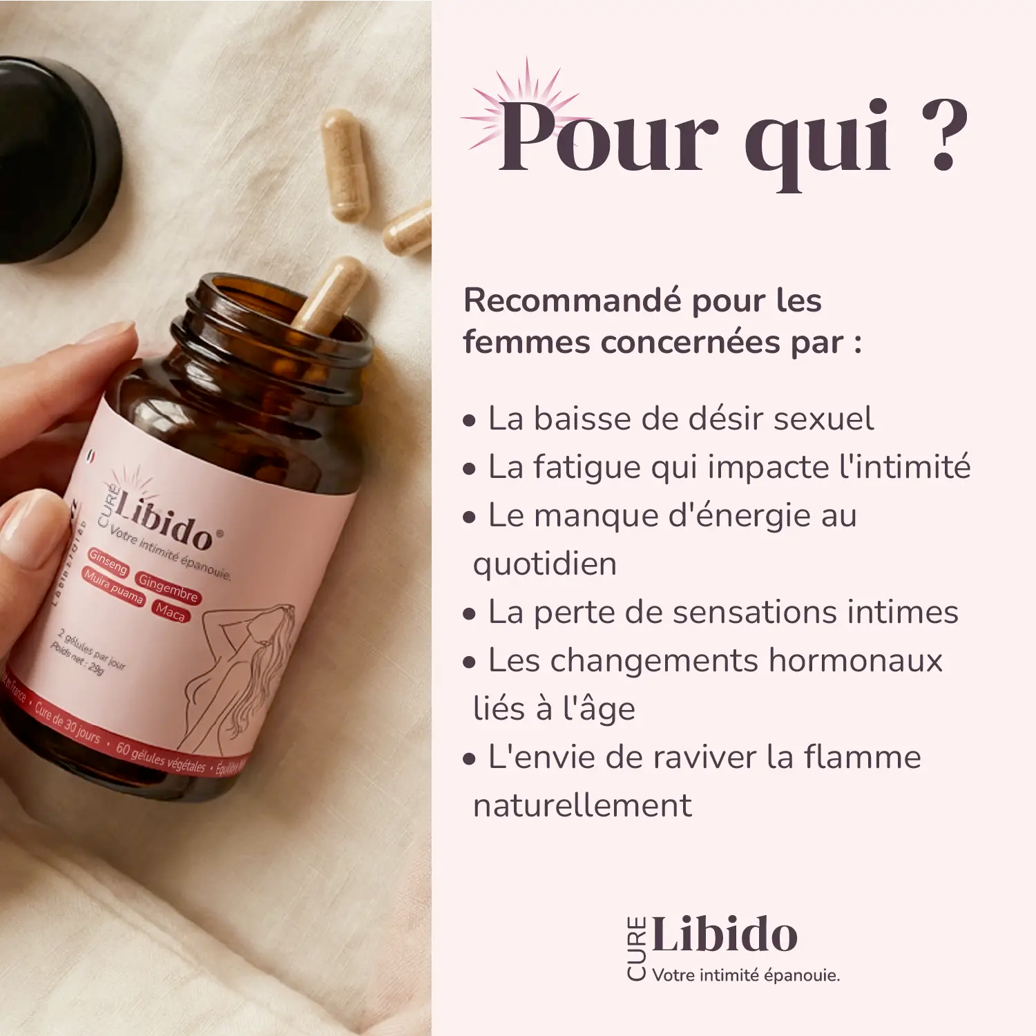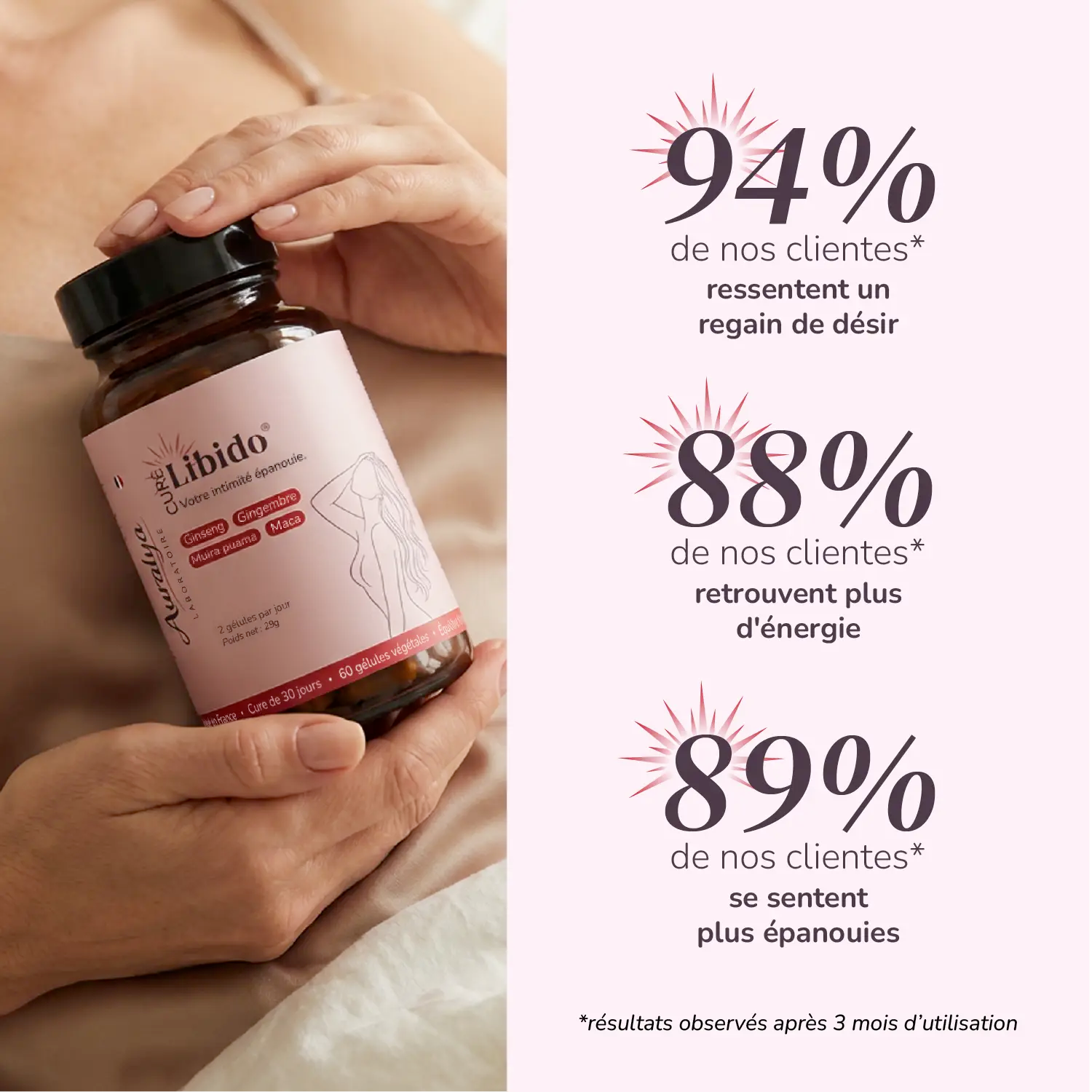 - Les résultats apparaissent progressivement : regain d'énergie dès 2 semaines, retour du désir après 4-6 semaines. Cure recommandée : 8-12 semaines minimum