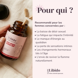 Votre désir ne doit pas s'éteindre avec l'âge, ni être un sujet de honte ou de résignation. Le complément Libido accompagne les femmes dans la reconquête naturelle de leur vitalité sexuelle et de leur féminité à chaque étape de leur vie.